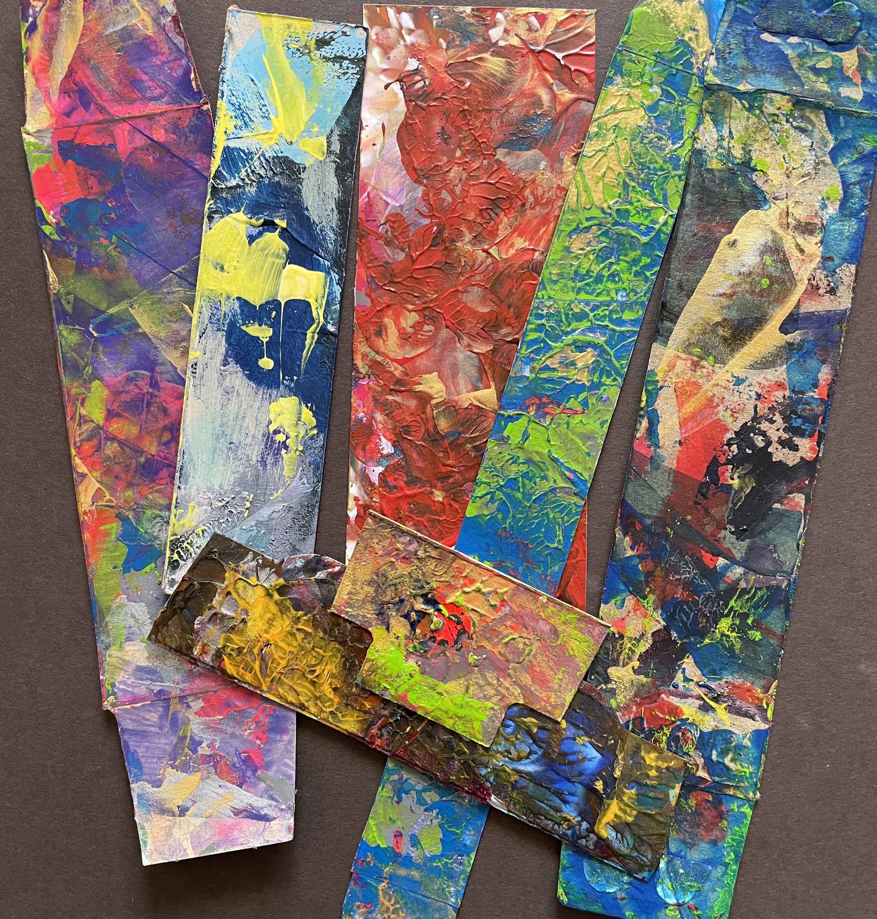 one day i was trimming a piece i had painted on a former cardboard cracker box, and looked at the scraps left over. as i held them, it was so clear they would make excellent bookmarks. since i love making use of recycled materials, it was so delightful the pieces would live on to add whimsy, color, and texture to people's beloved books and bookshelves.